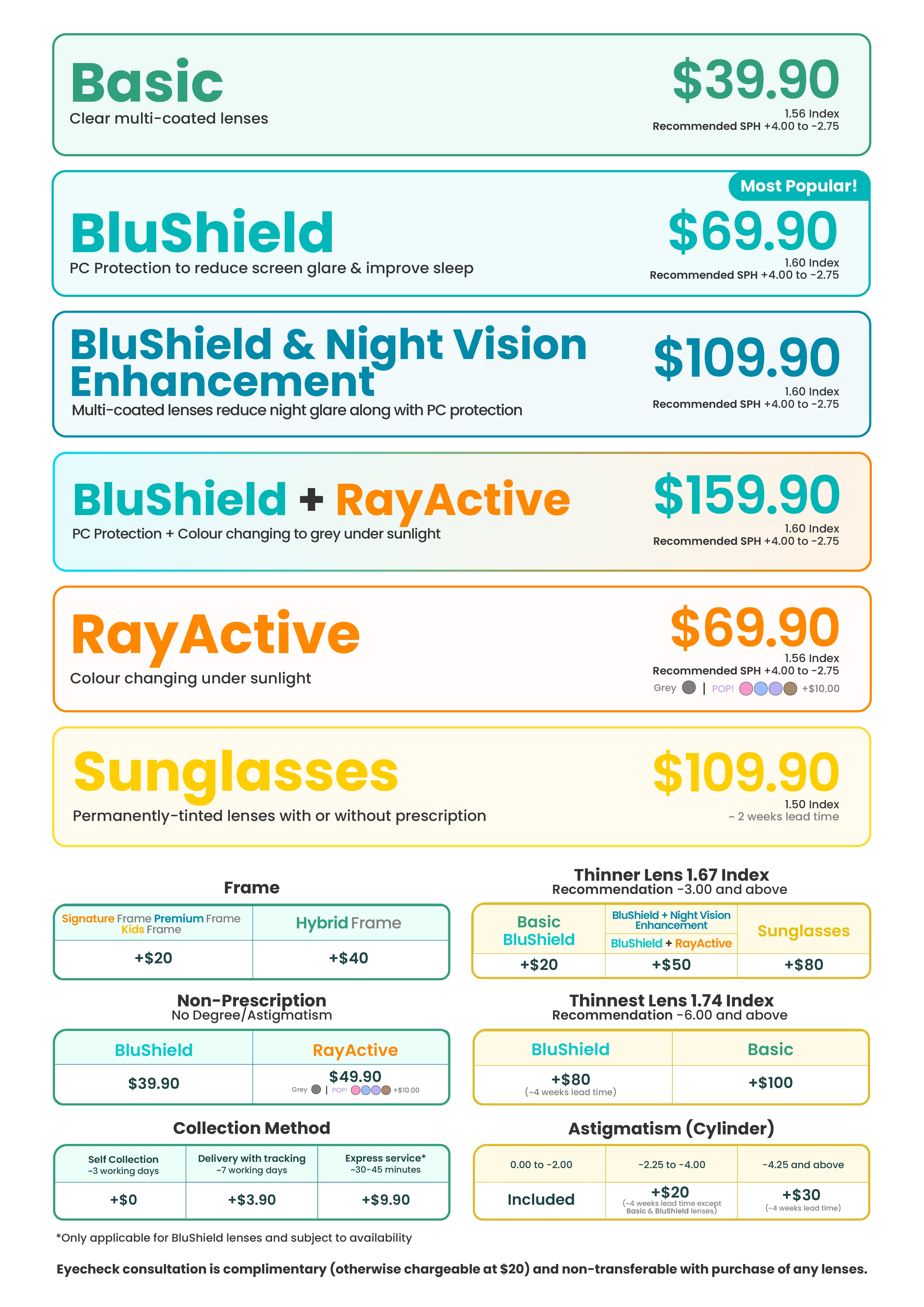 Our lenses (BluShield, RayActive and Basic) all include UV400, electromagnetic (EMI) protection, scratch resistance and water resistance coating.